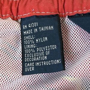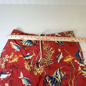 These Polo Ralph Lauren men's orange graphic Marlins surf swim trunks board shorts in size L are made from a comfortable cotton blend material. The geometric pattern and fish theme make them perfect for surfing activities. The swim bottom style is a classic trunk design with features like a lined interior, built-in brief, hook & loop fly, elastic waist, pockets, above-the-knee length, and drawstring for a customizable fit. Easy to care for with machine washable instructions, these shorts are a stylish and functional addition to any man's swimwear collection.