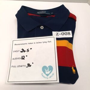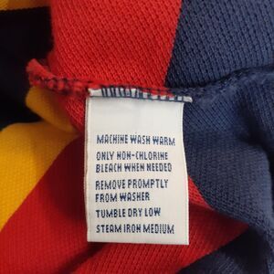 This Polo Ralph Lauren Men's Shirt in XL size features a colorful multicolor blue, yellow, and red stripe design on a knitted fabric. The shirt has a collared neckline with a button closure, short sleeves, and is crafted with a limited edition all-season design. Perfect for various occasions including casual wear, parties, or formal events, this vintage-inspired piece is part of the brand's classic collection and is machine washable for easy care. With a chest size of 26 inches and a regular fit, this shirt embodies a preppy and sporty style with accents like embroidered logos.