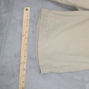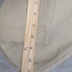 This pair of Polo Ralph Lauren men's shorts in size 30 features a classic American preppy style. The shorts have a flat front and belt loops, with a mid-rise waist size of 34 inches. They are made of cotton canvas material, which makes them easy to care for and perfect for summer, fall, and spring seasons. The shorts have multiple pockets, including cargo pockets, and come with a button and zipper closure. The beige tan khaki color adds a touch of elegance to the overall design. These vintage shorts are perfect for both casual and workwear occasions, and are a must-have for any Ralph Lauren fan.