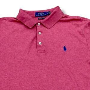 The Polo Ralph Lauren Men’s Size L Slim Fit Short Sleeve Top is a classic and preppy polo shirt made of 100% cotton, perfect for all seasons. It features a solid peach color, collared neckline, button closure, and designed specifically for a slim fit. This top is a versatile and stylish addition to any man's wardrobe.
