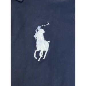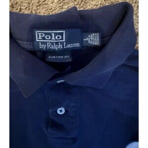 The is a Polo Ralph Lauren men's size large long sleeve custom fit casual navy polo shirt. It features the big pony logo on chest & #3 on right sleeve.