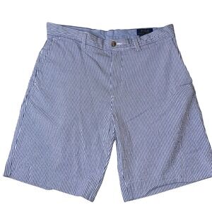 Keywords: Polo Ralph Lauren, men's shorts, striped shorts, seersucker shorts, classic fit, stretch shorts, casual shorts, size 31, blue and white shorts, summer shorts, preppy shorts, Polo shorts, Ralph Lauren shorts