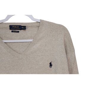 This Polo Ralph Lauren Men's Sweater in size 2XL features a tight-knit solid design in a cream beige color, made from lightweight and breathable Pima cotton. The sweater has long sleeves, a V-neckline, and a classic fit, suitable for travel, casual, or business occasions. Embellished with an embroidered logo, this preppy and minimalist pullover exudes a designer aesthetic perfect for a business casual or classic look in the winter, fall, or spring seasons.