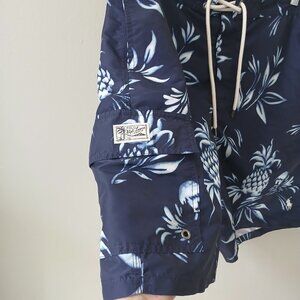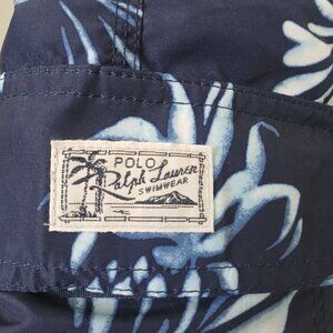 The product is a Polo Ralph Lauren navy blue swim trunk in size large, featuring a floral pineapple pattern. Made of polyester with a drawstring closure, this regular fit swim bottom is machine washable and perfect for recreational activities. The iconic Polo Ralph Lauren brand and logo add a stylish touch to this swimwear piece, making it a great choice for men looking for a comfortable and fashionable swimming option.