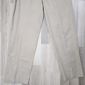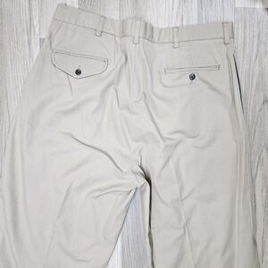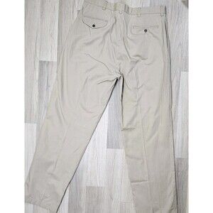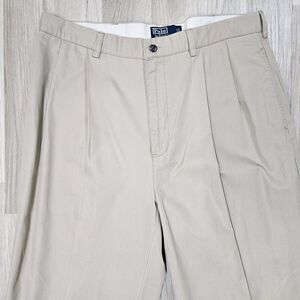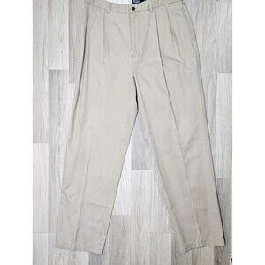This product is a pair of men's Polo Ralph Lauren tan pleated dress pants in size 36x34. The pants are made of cotton and feature a solid beige color, perfect for business occasions. They have a zip closure, pleated front, and a regular fit, making them both stylish and comfortable. Easy to care for with machine washable instructions, these pants are ideal for the winter, fall, and spring seasons. The preppy theme adds a touch of sophistication to this classic wardrobe staple.