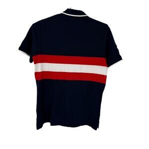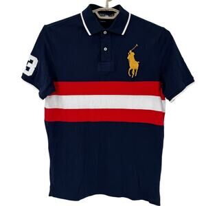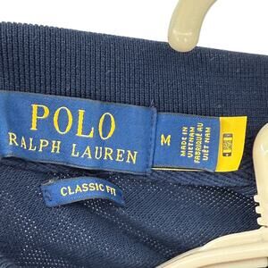 Navy blue classic fit mesh polo shirt. Red and white striped, number three appliquéd on the sleeve and a big gold embroidered polo man. Size medium in excellent used condition. Laid flat it measures approximately 21 inches armpit to armpit and the length on the top of the shoulder down the back 31 inches.