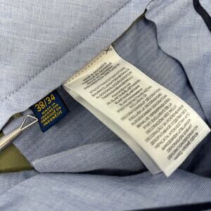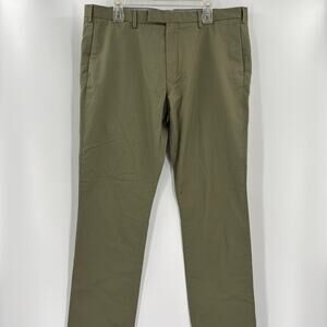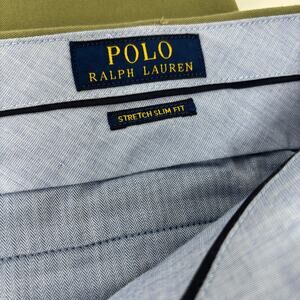 This is a pair of pre owned Polo Ralph Lauren Olive Green 38x33 Stretch Slim Fit Pants. This item is in good condition with minimal or no signs of use. Tag reads 34in for inseam but measured 33in.