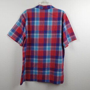 This Polo Ralph Lauren pajama shirt top is perfect for any season and features a classic plaid pattern in a bold red color. The short sleeves and button front closure provide a comfortable and secure fit, while the collared neckline adds a touch of sophistication. Made from 100% cotton and machine washable for easy care, this lightweight top is ideal for summer, fall, and spring. With its woven fabric type and no vintage features, this pajama top is a modern classic. It comes in a size M and is suitable for regular size types. Made in Indonesia, this top is a great addition to any sleepwear collection.