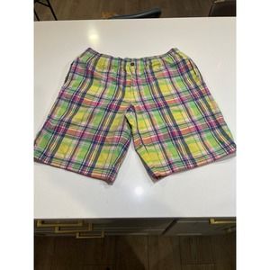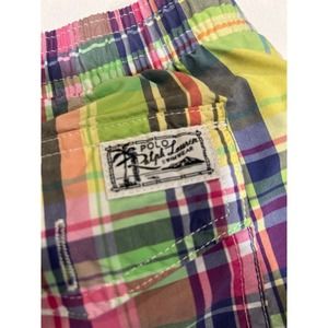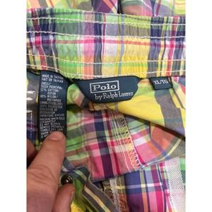 Polo Ralph Lauren Plaid Swim Suit Shorts - Mens XL - 52% cotton 48% nylon - no liner - you could wear these as normal shorts as they have a zipper - yellow green purple pink Easter pastels colors