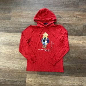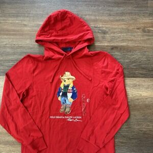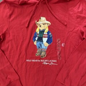 For sale is a Polo Ralph Lauren Polo Cowboy Bear Hooded Long Sleeve T Shirt Small Flaw Tag Red. This piece is new without tags. The polo tag has been marked through. See images for exact condition. See images for measurements. Feel free to message me with any questions!