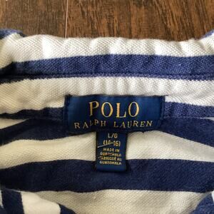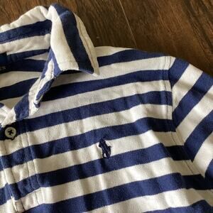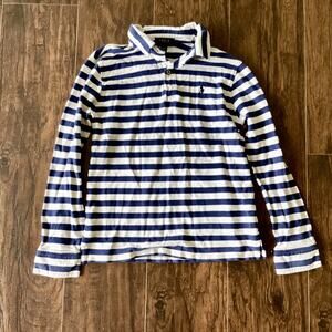 Navy blue and white stripes long sleeve polo shirt from Polo by Ralph Lauren in very good preowned condition. Some color dulling from washing. No other flaws.