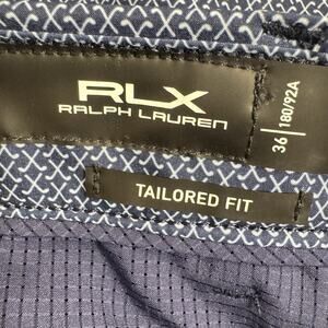 The Polo Ralph Lauren RLX Men's 36 Shorts in Navy Blue are designed for casual occasions with a flat front and mid-rise fit. Made from water-repellent polyester, these shorts feature a 5-pocket design and a 9-inch inseam, perfect for golfing or other outdoor activities in the summer or spring. Machine washable and with a MSRP of $115, these stylish shorts embody the classic Polo Ralph Lauren brand with a modern twist, ideal for any man's wardrobe.