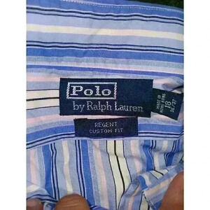 This Polo Ralph Lauren Regent Custom Fit Button Down Shirt features a colorful striped pattern, long sleeves with a button closure, and a button-down collar. Made from cotton material, this vintage shirt is perfect for all seasons and comes in a size 18 for men. The shirt is branded with Polo Ralph Lauren and was made in Hong Kong.