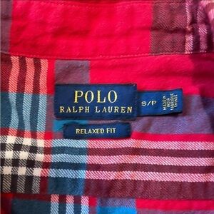 Polo Ralph Lauren Relaxed Fit button down long sleeve shirt in a red, green, and white madras style all-over check plaid pattern. Two breast pockets with buttons. Size Small. 100% cotton. Excellent condition