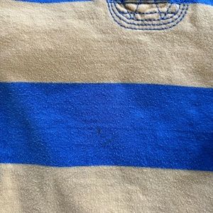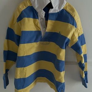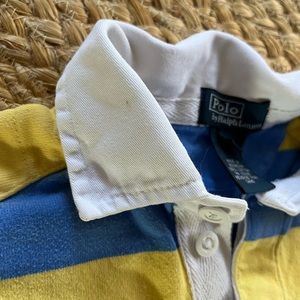 Classic RL rugby in yellow/blue stripe. Two small pin-head stains on collar and front, as shown. Minor pilling with lots of wear left!
