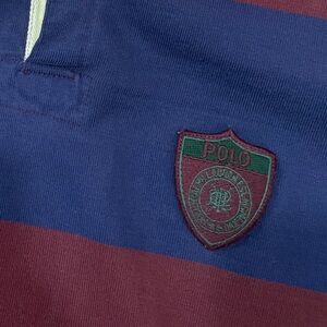 Classic rugby style shirt featuring bold maroon and navy stripes. Perfect for casual outings or sports events. Polo Ralph Lauren with cool Polo crest on the front. Shoulder padding and elbow pads for authentic look. Could actually be used to play rugby in. Size XL Smoke free pet free home