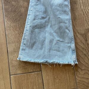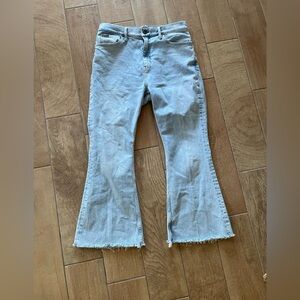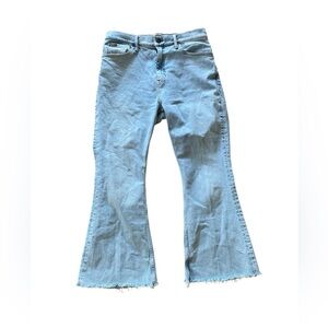 Description: light wash, flare cropped, raw hem, high rise
