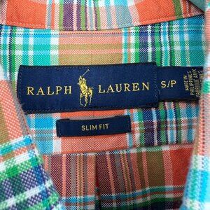 Stylish men's Polo Ralph Lauren shirt in a vibrant blue and orange plaid design. This 100% cotton shirt features the iconic embroidered Polo pony and is a size small.