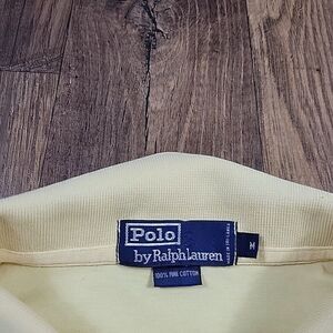 Polo Ralph Lauren Shirt Mens Medium Yellow Fine Cotton Golf Logos Crest Preppy. Garment has small spots on front/back