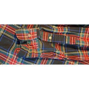 Stylish Polo Ralph Lauren slim fit button-down shirt size large ideal for adding a classic touch to any wardrobe. Could also be a Christmas Shirt. This shirt features a vibrant plaid pattern in shades of red, green, blue & yellow creating a visually appealing design. The shirt is designed with a point collar and finished with a signature embroidered blue pony logo on the chest. Rounded hem