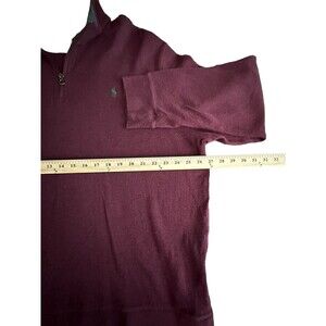 The burgundy color and embroidered logo accents add a touch of designer style, while the 1/4 zip closure and breathable material provide comfort and functionality. This sweater is available in size 2XL and is made of cotton material with a knit fabric type. Don't miss out on this classic and modern piece from Polo Ralph Lauren. Great preowned condition!
