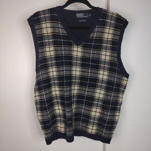 Polo Ralph Lauren Sweater Vest Mens XL V Neck Lambswool Blue Plaid Vintage