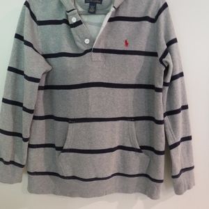 Polo by Ralph Lauren long sleeve gray hoodie with navy blue stripes and navy blue Polo sweatpants with drawstring waist and pockets.