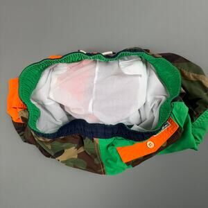 Bold and sporty swim trunks from Polo Ralph Lauren featuring a high-contrast colorblock design with camo print, blaze orange, kelly green, and navy waistband. Includes a mesh lining, drawstring waist, and snap back pocket with button flap. Youth XL fits like a men's Small. Made from 100% recycled polyester. Excellent condition with no holes or stains.