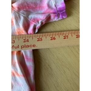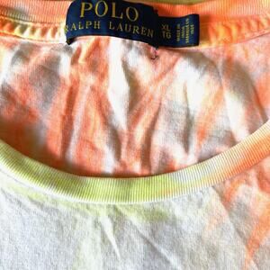 The product is a Polo Ralph Lauren T-Shirt for men in size XL, featuring a tie-dye retro design in cream, pink, and orange colors. The shirt has short sleeves, a crew neck, and a relaxed fit, made of cotton material. With a hippie character and retro theme, this tee is perfect for summer, fall, and spring seasons, suitable for those who love the 70s and Grateful Dead aesthetics.