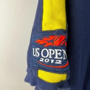 Authentic Polo by Ralph Lauren men’s polo shirt, custom fit, size L. Features bold green Big Pony logo on front and back, colorful yellow/blue panels, and “US Open 2012” embroidered patch on the sleeve. Classic navy blue base.