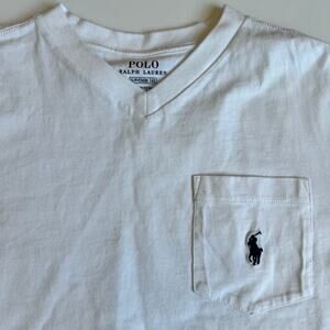 Size Small (8), Polo Ralph Lauren short sleeve v-neck t-shirt bundle. No major flaws. Light wear. Blue has some pilling. See close up photo. I dont see any spots on the white pocket tee. Good/fair used condition to be safe.