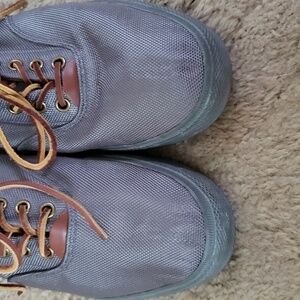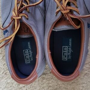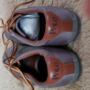 Polo Ralph Lauren Vaughn shoes, sneakers, brown leather laces, rubber outsoles, material upper, small pony, men's size 10. Great condition no flaws.