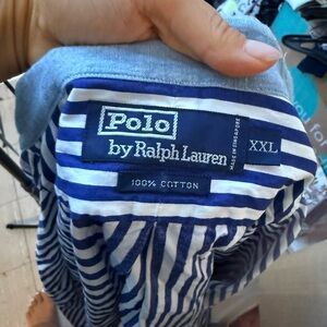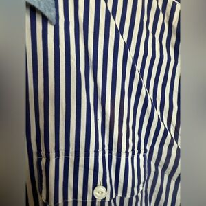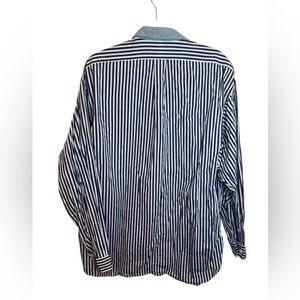 Pre owned overall excellent condition vintage blue and white striped button down shirt with denim collar. There is one small spot that looks like it has minor sun fading (pictured). Such a cool shirt. Men’s size xxl.