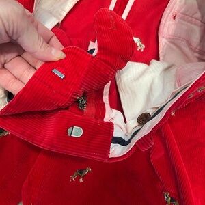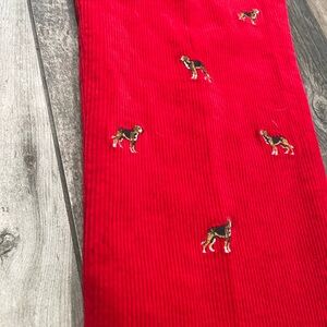 Heavy thick cords. Embordiery hunting dogs all over. Straight leg. Some red bleeding on inside pockets and waist band- can’t see when on.