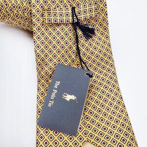 Vintage Polo Ralph Lauren "The Polo Tie" 100% silk neck tie made in Italy measuring at 56" long and 3.5" at widest point, new with tag. Geometric pattern, with the main color being an overall yellow/gold hue. Ships safely in a secure box :)