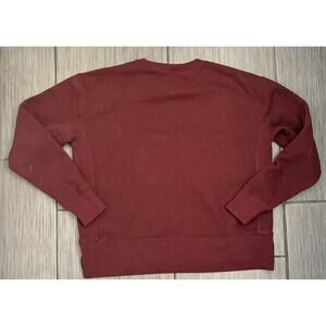 The product is a Polo Ralph Lauren Women’s Burgundy Crew Neck Sweatshirt in size small, featuring a white pony logo accent. This pullover sweatshirt is made from a blended fabric of polyester and cotton, making it lightweight and easy to care for. It is designed for activewear occasions in the summer, fall, and spring seasons, with long sleeves and a regular fit. The classic American and 90s themed sweatshirt is machine washable and perfect for casual travel or preppy outings. Pit to pit is 21 inches. Top of shoulder to bottom is 22 inches in front, 23 inches in back. There are a few discolorations (see photos).
