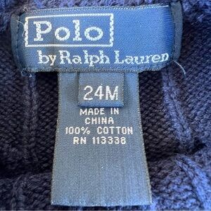 Polo Ralph Lauren Preppy Cable Knit Sweater. Y2K era. Toddler size 24 months. Navy with Red accent. (2) Tortoise shell logo buttons at the shoulder. 100% cotton.
