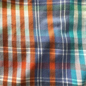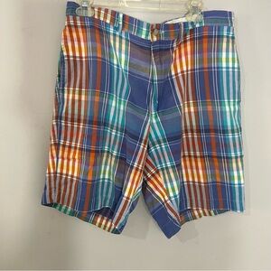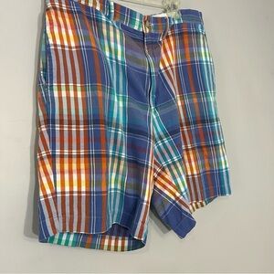 Colors: Vibrant plaid shorts with a mix of blue, orange, and green.