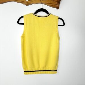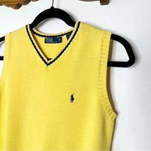 Bright yellow V-neck sweater vest. Iconic Polo logo on chest. Perfect for layering.