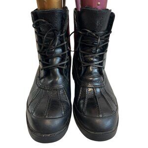 Polo Ralph Lauren boots, Udel Forty Thieves, black leather and rubber, red tartan with white print, lace up, water resistant, shearling lining, US men's 7 D, preowned and shows wear on the soles, creasing, scuffs, came from a pet friendly home, replacement leather laces - see photos