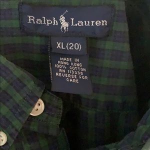 Slightly used green plaid Ralph Lauren button down. The size is XL (20) but Fits like a men’s medium