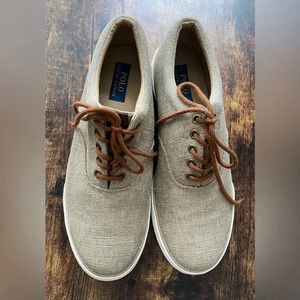 Men’s burlap/linen look fabric. On the right shoe is the tan, traditional Ralph Lauren logo, embroidered polo player. Brown shoe laces. White rubber sole. Very good, used condition. ,