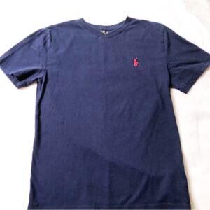Polo Ralph Lauren navy blue v neck tee. Size Small or 8. Very good preowned condition. Some wash wear and minor color fade. Tiny water spot on front.