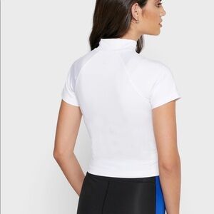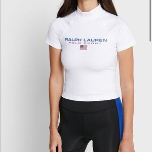 Smooth and stertchable polyester fabric Contrast graphic USA flag print on front Ralph Lauren Polo Sport signature branding Good news - forget that expensive membership, because in this performance top from Polo Ralph Lauren, the whole world is your gym. The fields are your gym, the streets, the park... the actual gym. But it's okay if the sofa is your gym too...great for swim or the outdoors. Featuring a stand up collar, a printed logo to the front, short sleeves and a fitted silhouette.