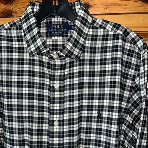 Men’s Polo Ralph Lauren button down slim fit shirt. Size XL. Black/off white plaid. 100% cotton. Lightweight. Great for the office or casual. It may be brand new. No tags but I don’t think my husband ever wore it. Approx measurements- 24” pit to pit and 30” top to bottom.
