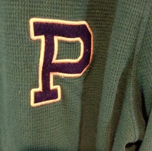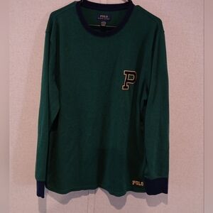 Green long sleeve shirt featuring a prominent 'P' logo. Polo branding at the hem. Comfortable and stylish.