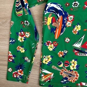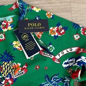 Comfy and stylish for swim days, this moisture-wicking rash guard from Polo Ralph Lauren features UPF 50 protection from UV rays, stretch, and a tropical-inspired Polo Bear print.