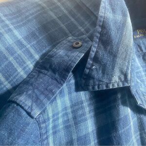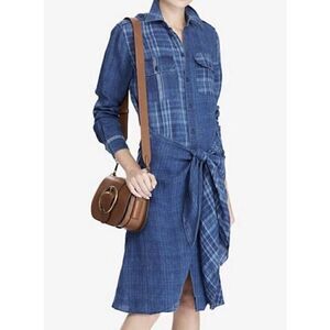 Polo Ralph Lauren Indigo Dyed Blue Plaid Linen Tie Front Sarong Shirt Dress