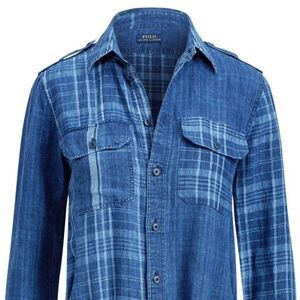 An eclectic mix of indigo-dyed plaids and sarong-like tie at the waist styling, puts a wonderfully fresh spin on Polo's signature shirtdress.