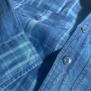 Supple but with body, medium gauge linen, in rich shades of indigo blue, with mixed plaid panels.